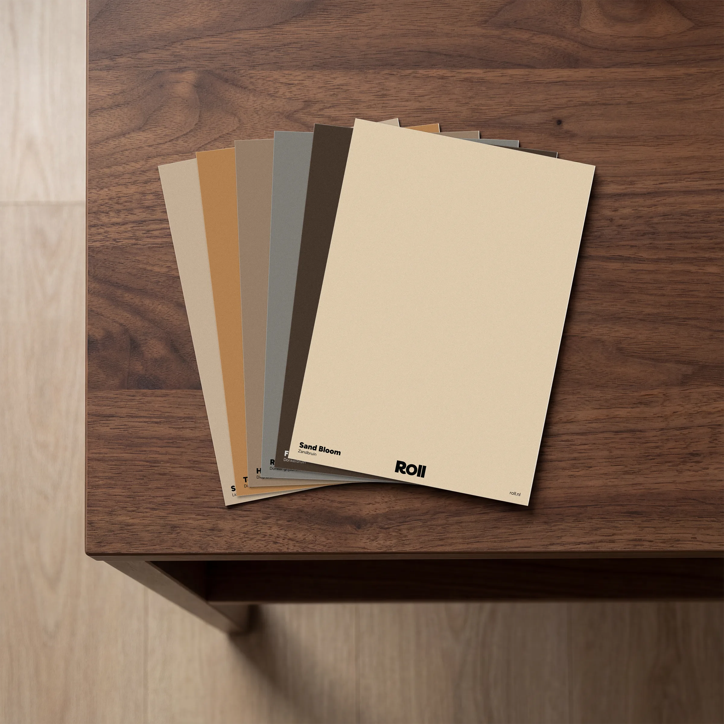 Tip van Roll: Plak de A5-kaarten op verschillende muren in de ruimte en bekijk ze op verschillende momenten van de dag. De lichtinval heeft grote invloed op hoe diep de bruintinten ogen.